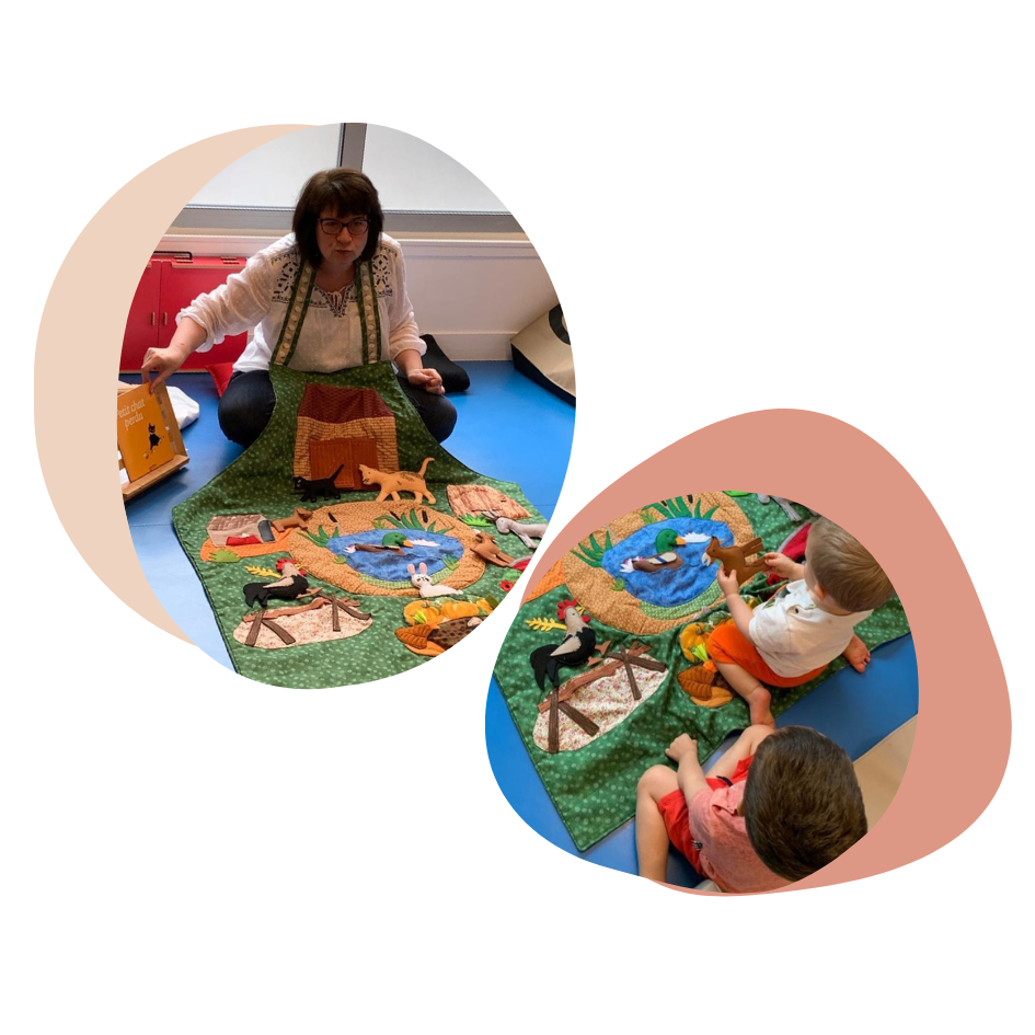 - animer des ateliers en chantant (comptines, jeux de doigts) et en racontant des histoires pour les tout-petits avec mes raconte-tapis et/ou kamishibai
